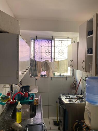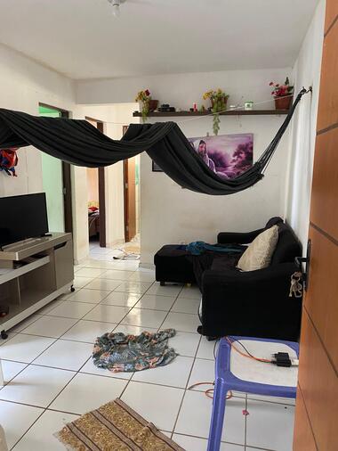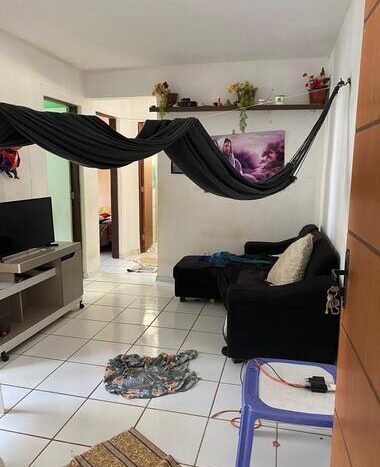 Apartamento com 2 quartos, sala, cozinha com área de serviço e banheiro social.
